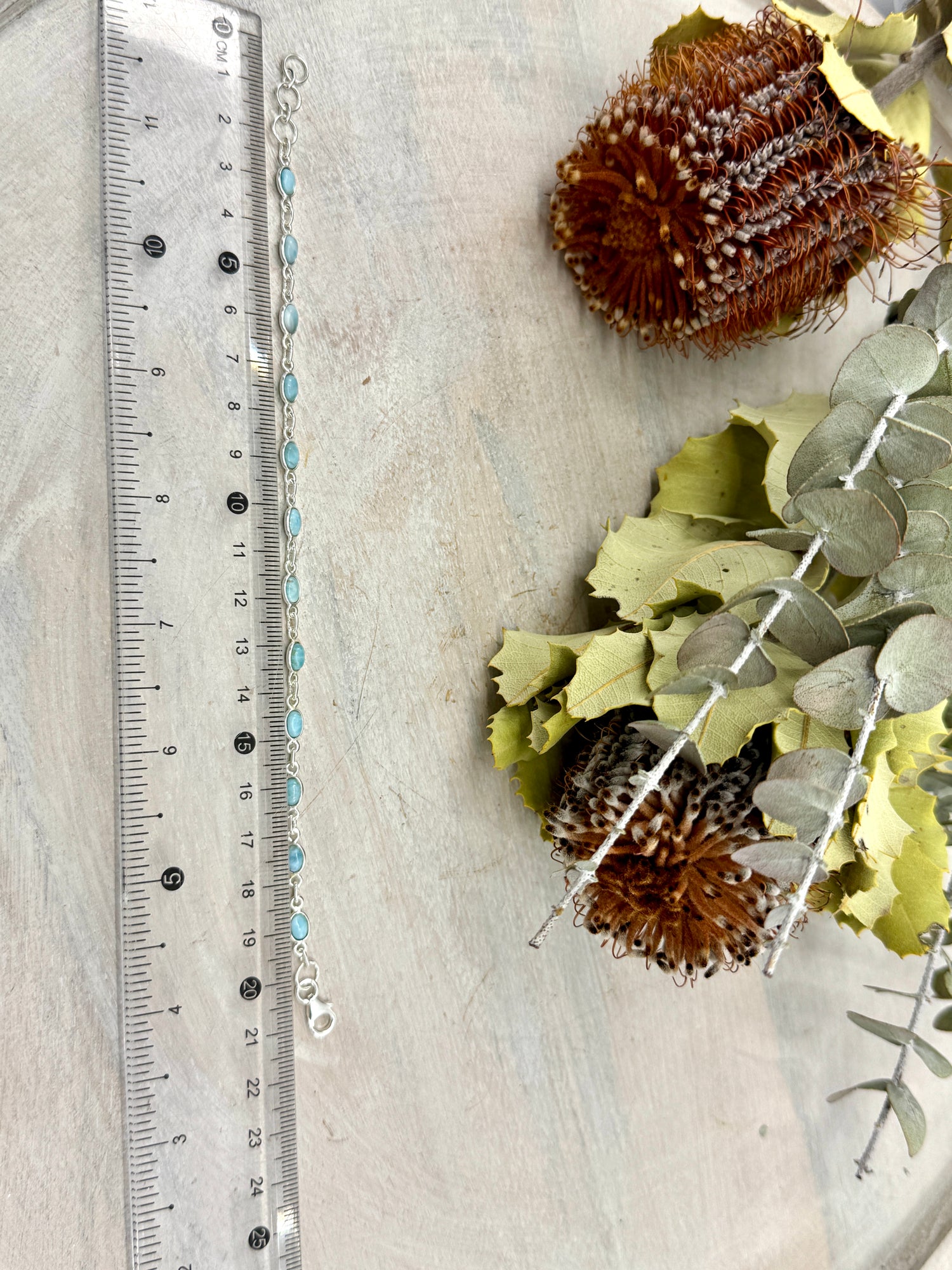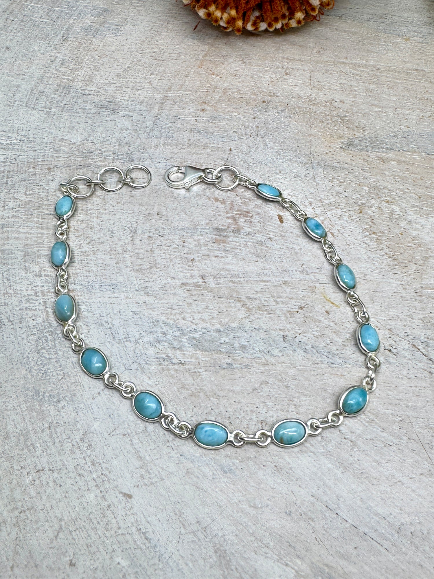 Approx. 19–20cm length including clasp. Each Larimar oval approx. 0.6–0.8cm. Natural colour and pattern variations make each bracelet uniquely radiant. Gift box and information card included.