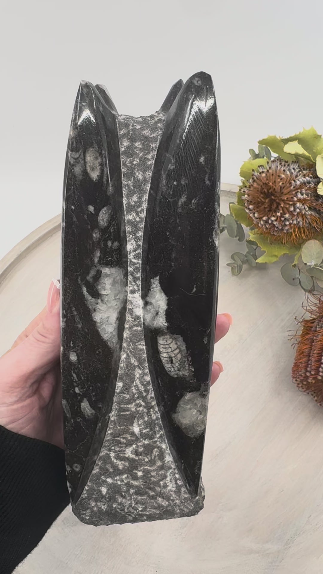 This striking tower is carved from the ancient remains of Orthoceras, an extinct marine creature over 400 million years old. Fossil Orthoceras is believed to carry the grounding wisdom of the Earth and the ocean, making it a powerful tool for transformation, past-life healing, and connection to ancient knowledge.