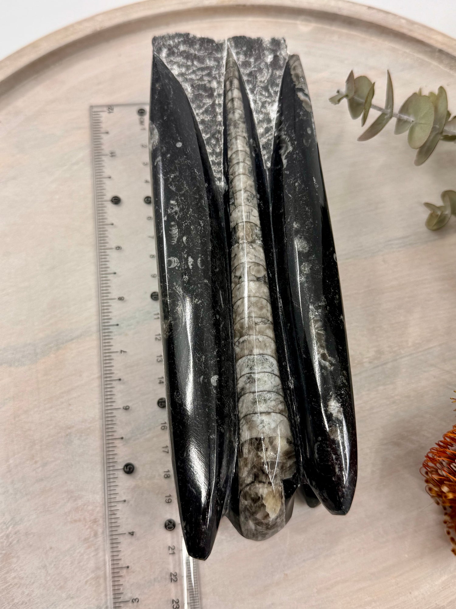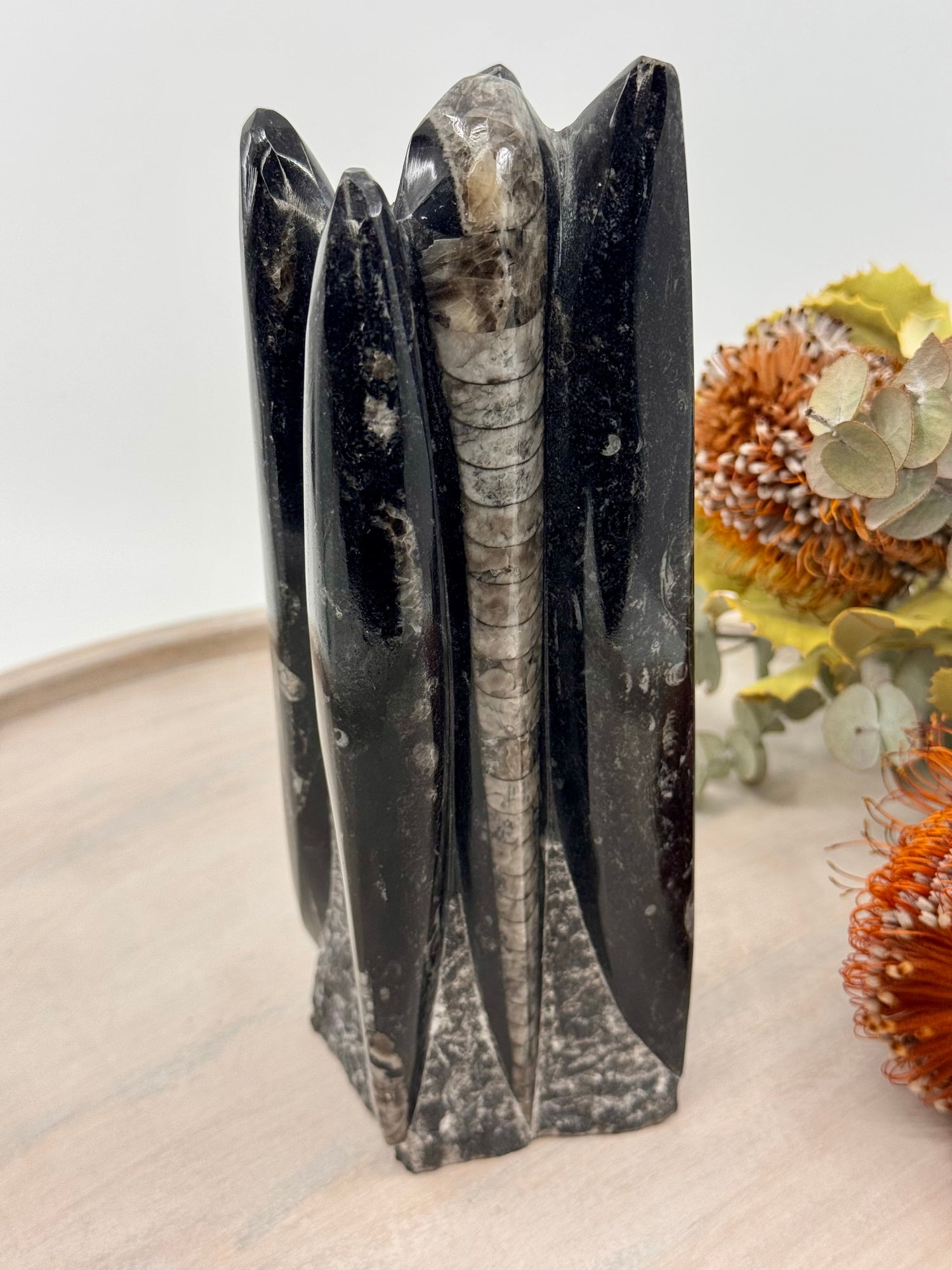 Each tower is a unique piece of natural history, combining timeless beauty with spiritual energy. Perfect for meditation, healing work, or as a distinctive piece of decor, Fossil Orthoceras brings stability, endurance, and the Inspired By 3 essence of wisdom, love, and power into your sacred space.