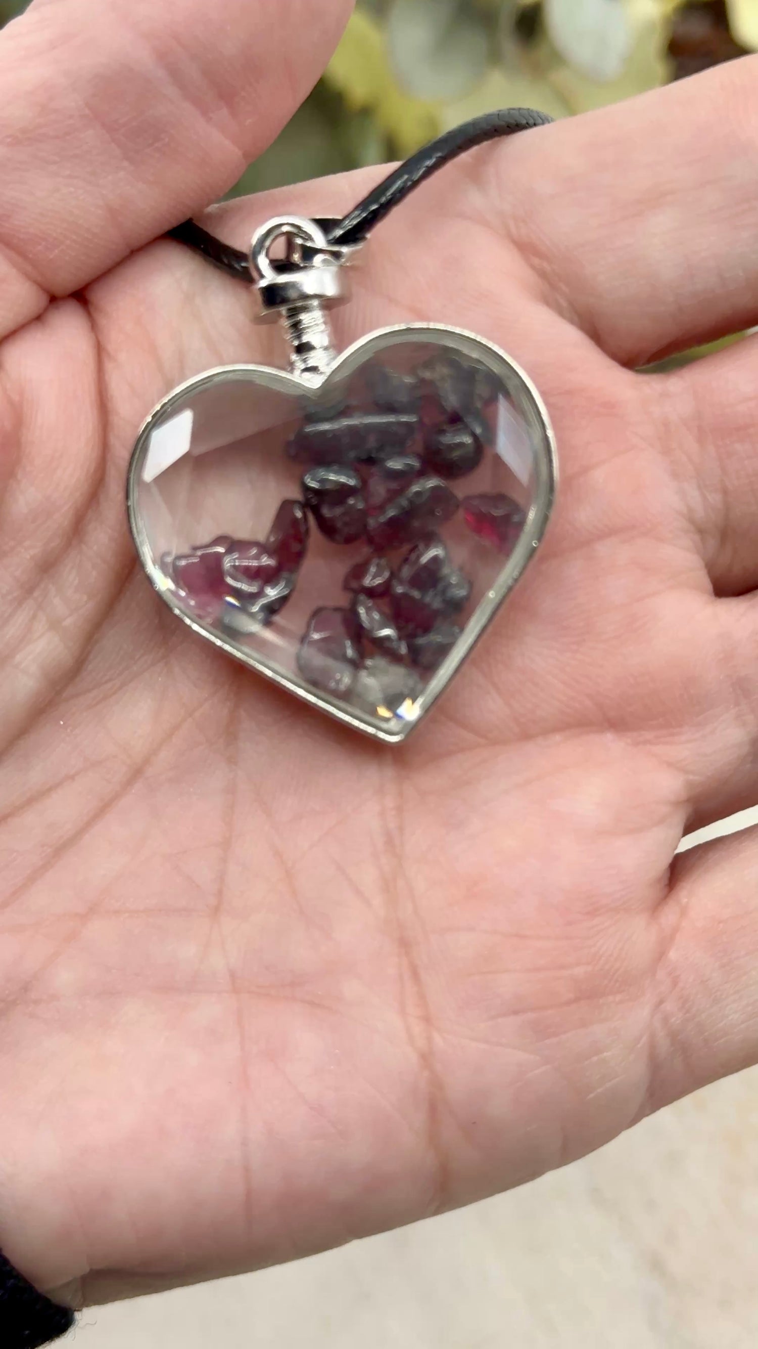This striking Garnet Heart Bottle Pendant embodies vitality, passion, and courage — a symbol of life force held within a crystal heart. Filled with genuine Garnet chips and encased in a clear glass bottle with platinum-plated alloy findings, it radiates grounding energy and powerful motivation.