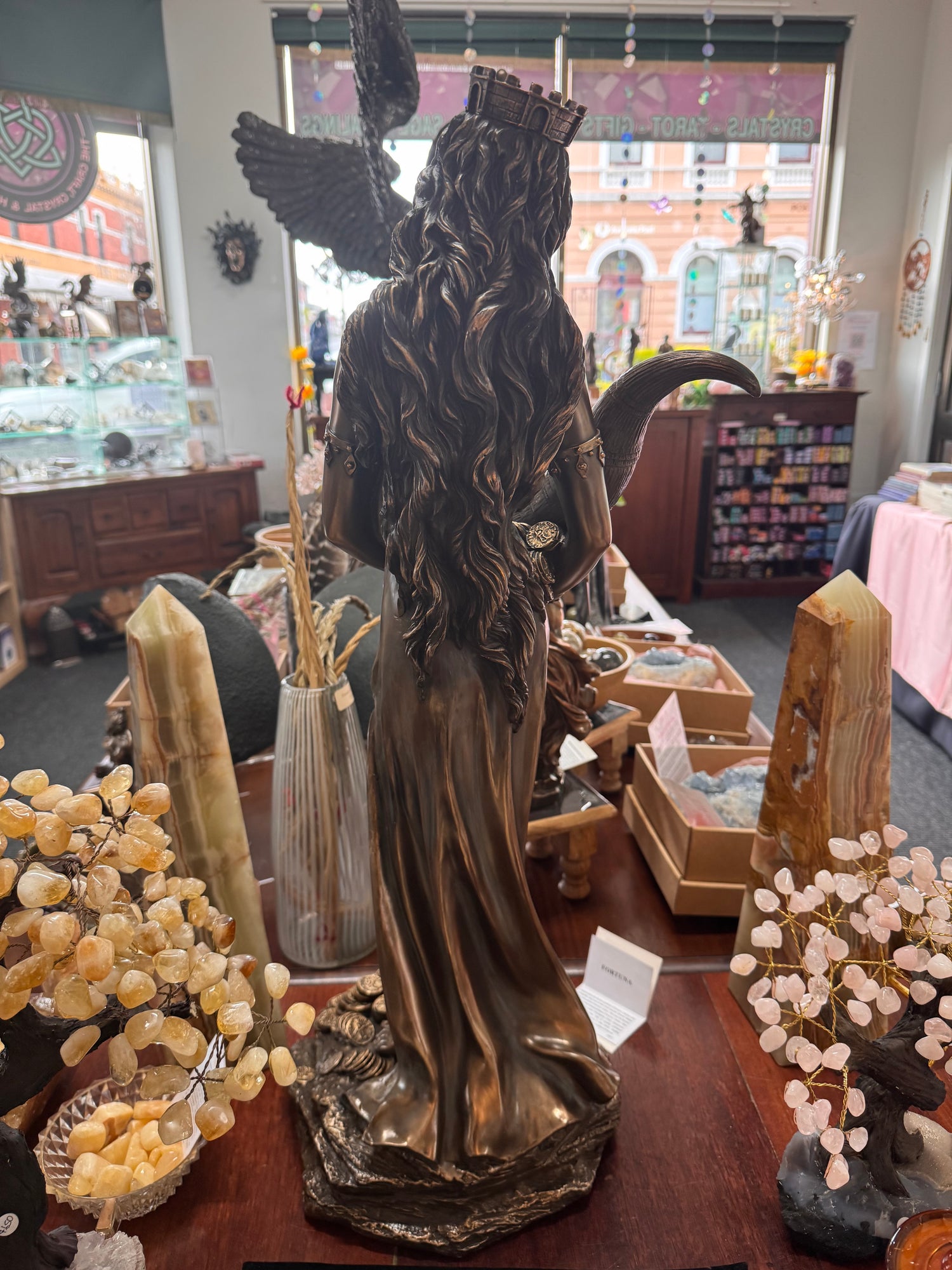 Fortuna, the Roman goddess of luck, abundance and destiny, is beautifully depicted in this commanding large bronze statue. Crafted from cold cast bronze, this piece radiates elegance and divine presence, making it a striking focal point for any altar, sacred space or home.