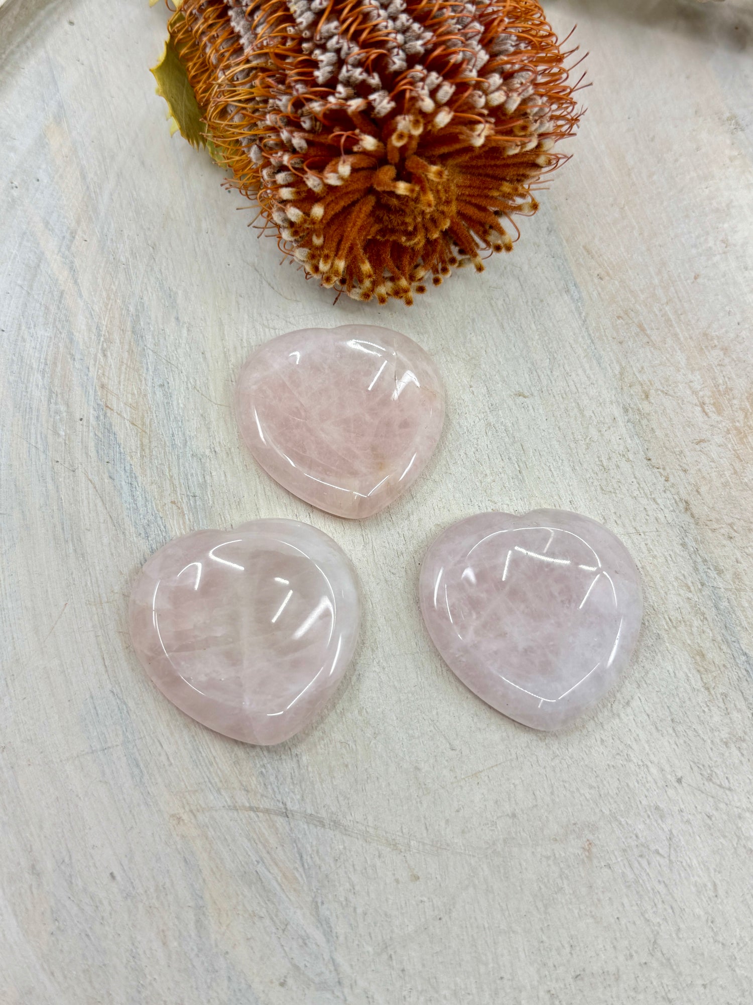 (Natural Rose Quartz varies from soft blush to deep rose tones — each piece is beautifully unique.)